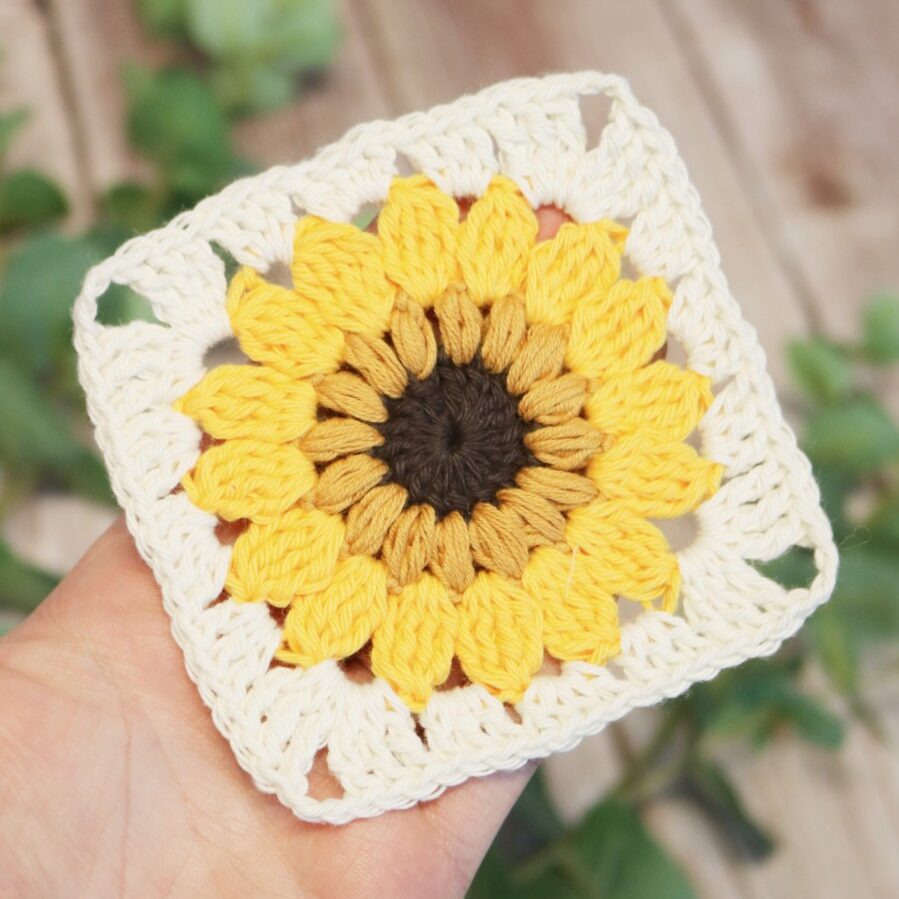 Her finder du hækleopskriften på den smukke oldemorfirkant med en sol – firkanten kan bruges til at fra tasker og bøllehatte, til tæpper og puder!