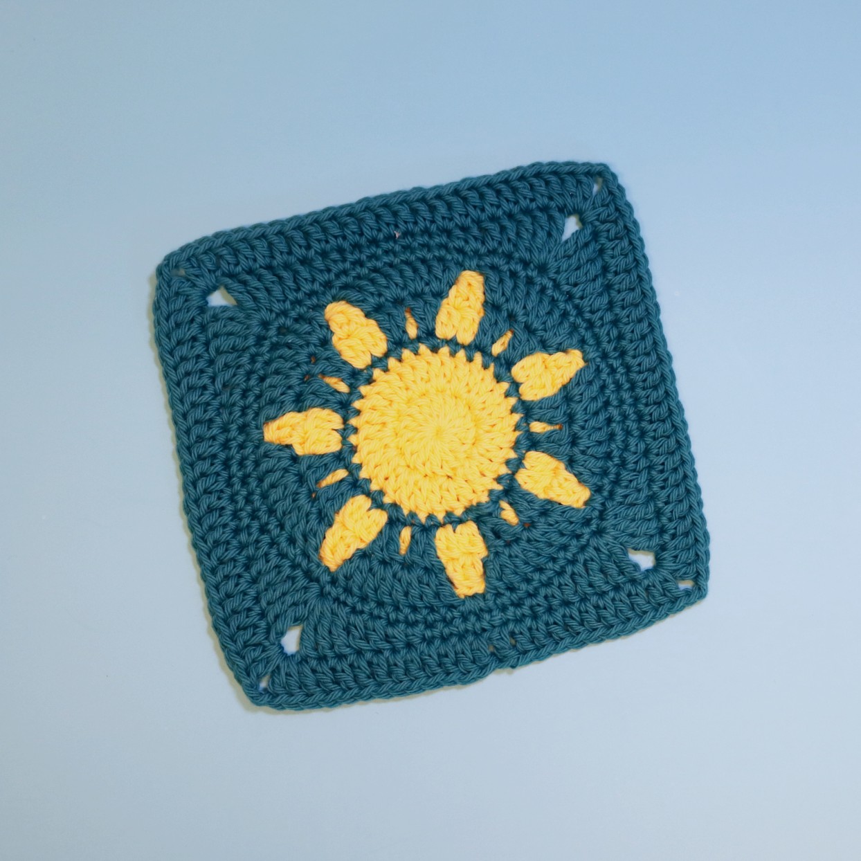 Til firkanten på billederne har jeg brugt Cotton nr. 8 i lysegul, nr. 3040 til solen (farve A), og petroleum, nr. 8029 til resten (farve B).