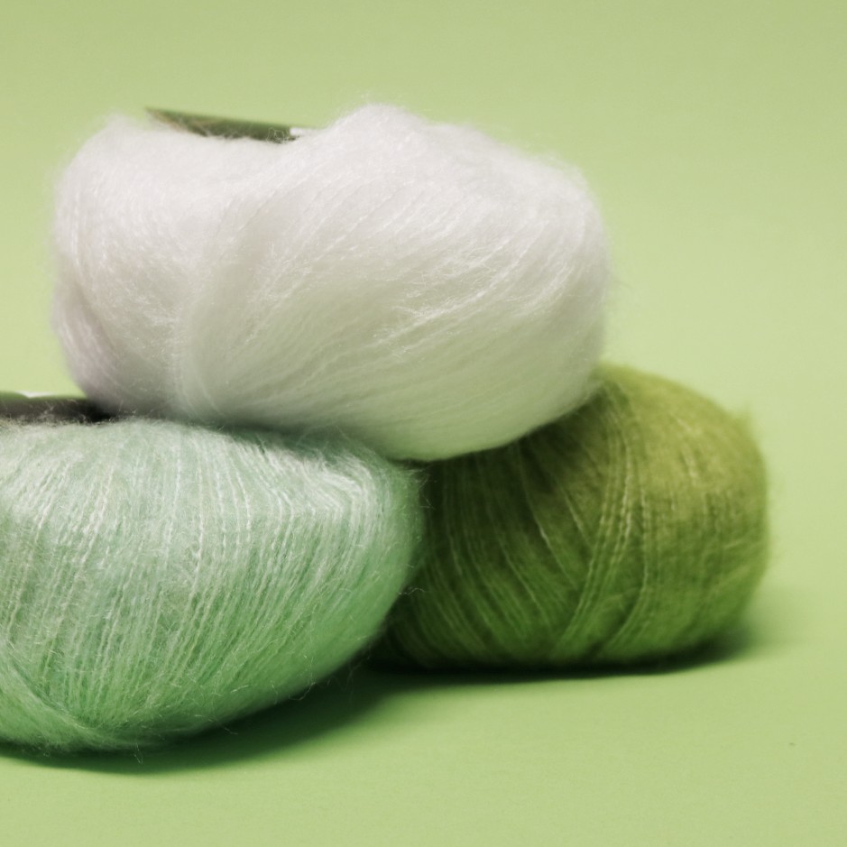 Dette især godt som følgetråd til en sweater, eller bare hvis man gerne vil have et mere ‘fluffy’ look. Hvis garnet bruges alene, giver det et lækkert og meget let resultat.