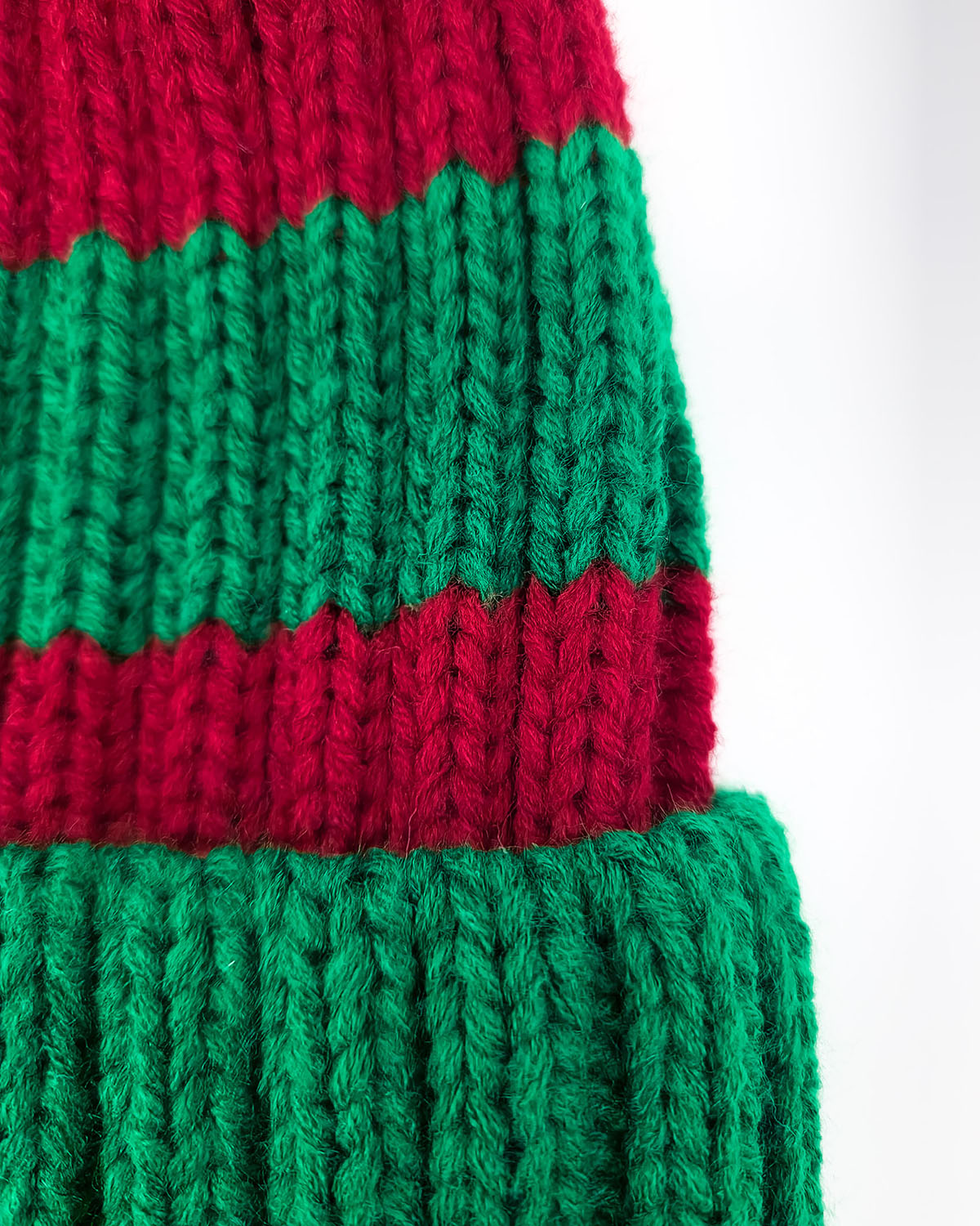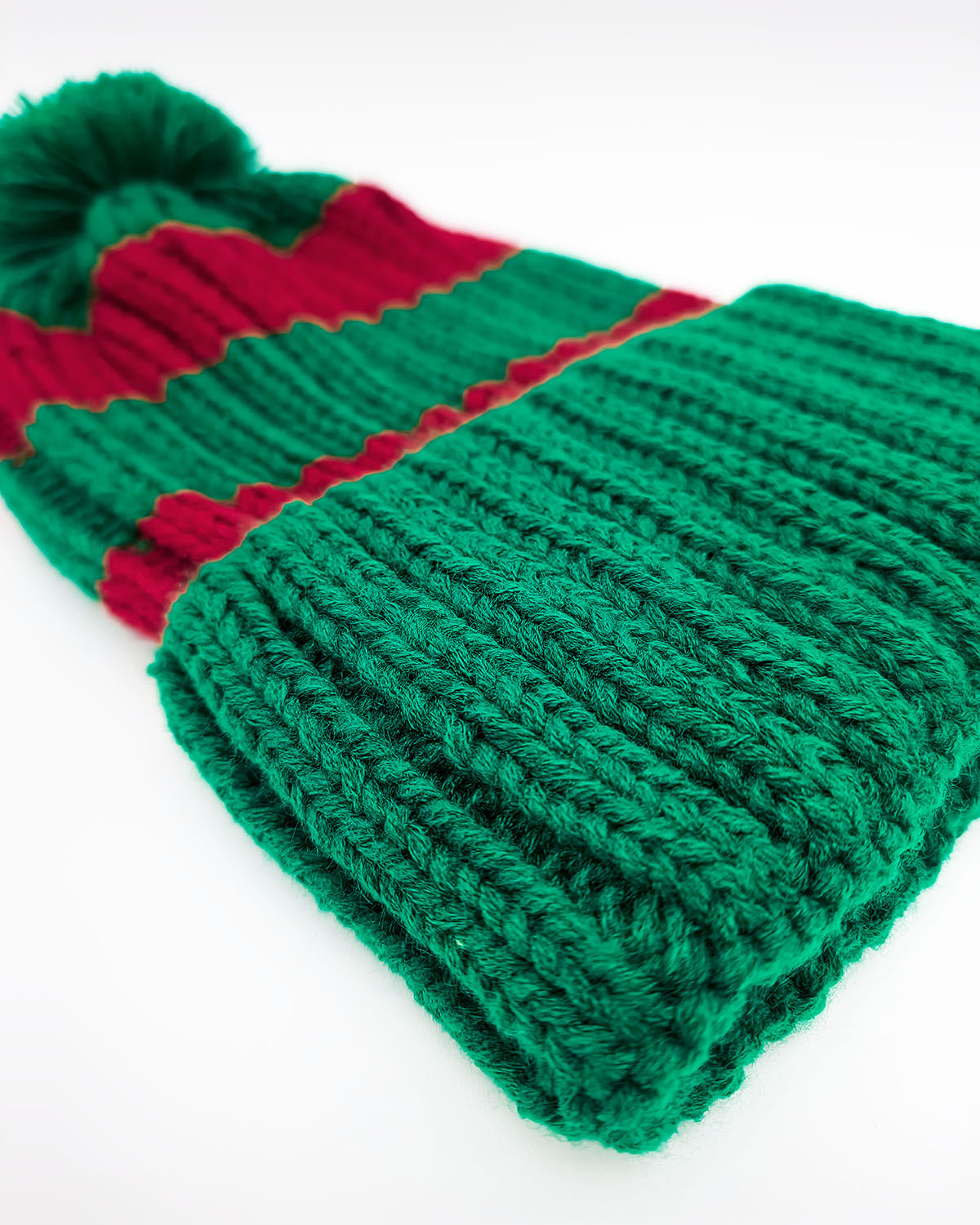Flot julebeanie i ribstrik der både spreder julestemning og holder hovedet varmt. Huen er lavet af ribstrik, som gør at den er meget elastisk, og passer derfor til både børn og voksne.