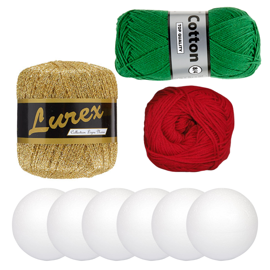 Kittet indeholder materialer til 6 julekugler, og der vil også være garn til overs til flere projekter. Der er lagt op til at man kan lave tre vinrøde julekugler med guld striber og tre mørkegrønne julekugler med guld striber, men man kan naturligvis bare lave de julekugler man har lyst til.