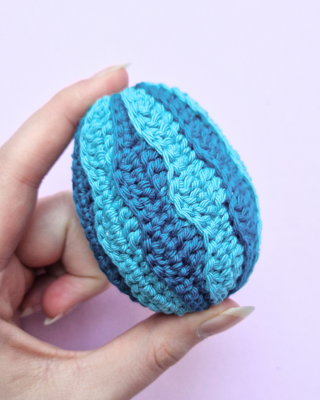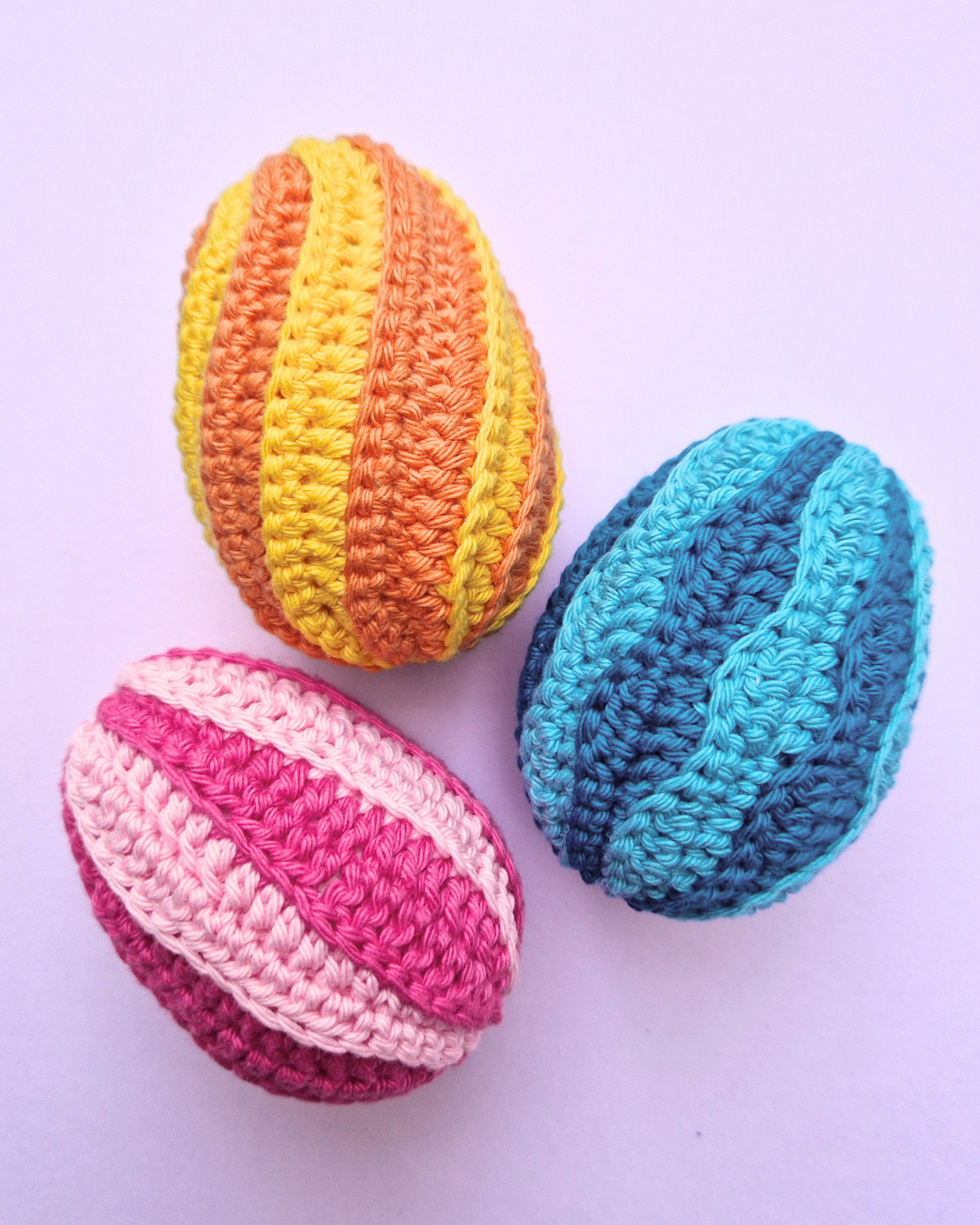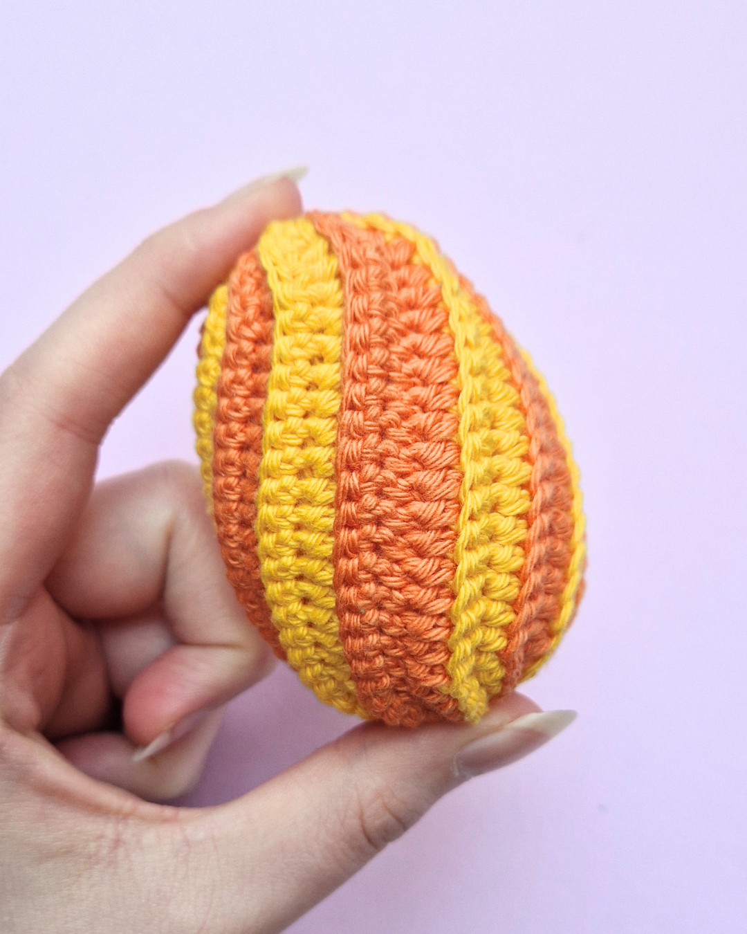 Til hvert æg skal der bruges i alt 7-8 g garn, vælger du at lave striber i 2 farver (som dem der er vist på billederne), skal der altså bruges ca. 4 g pr. farve.