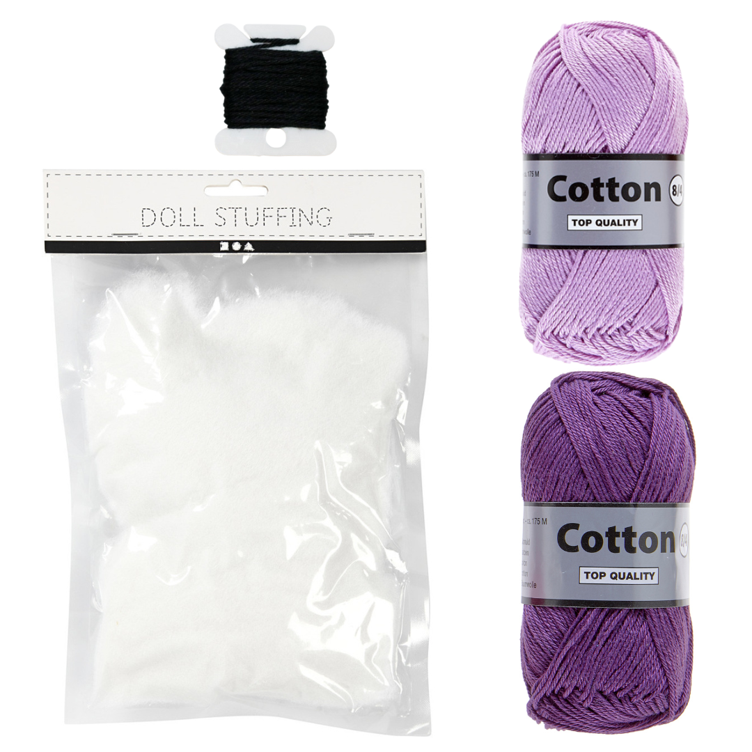 Note: Denne opskrift er oprindeligt hæklet med bomuld 8/4 af mærket Infinity Hearts Rose 8/4, hvilket er det garn der er angivet i opskriften – dette udgår dog fra webshoppen, og derfor er dette hæklekit lavet med bomuld 8/4 af et andet mærke, altså den samme garntype, blot en anden producent – selvfølgelig i tilsvarende farver.