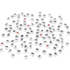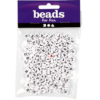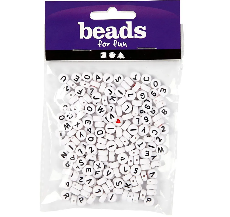 Hvide perler af plastik med sorte bogstaver fra A til Z.