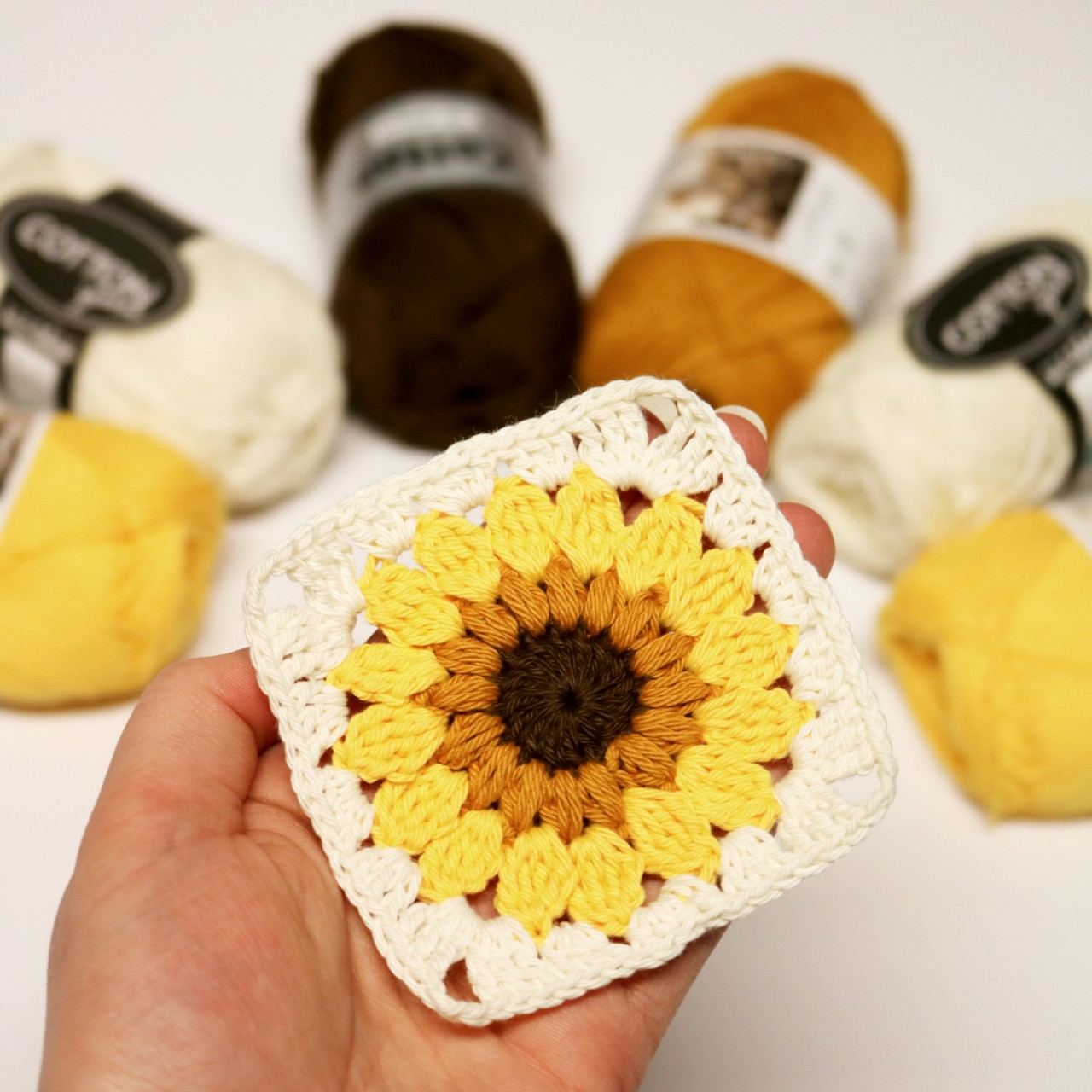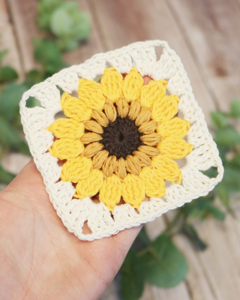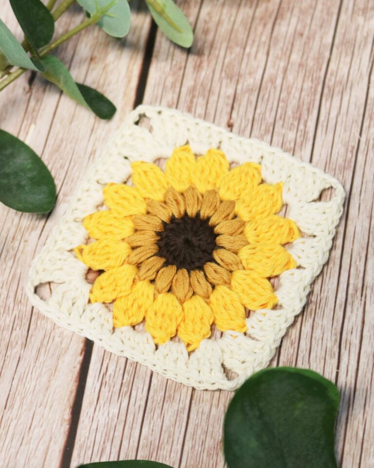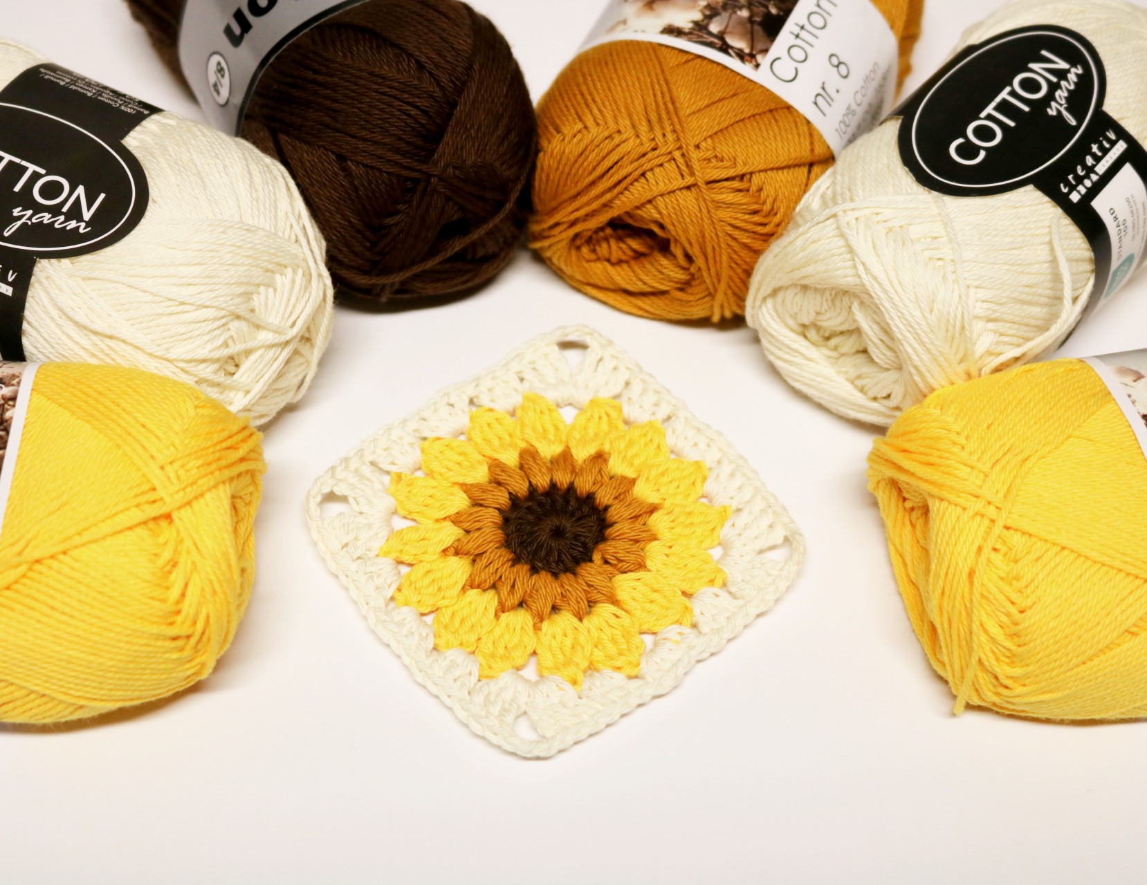 Her får du et hæklekit/garnpakke til at lave de smukke hæklede solsikke-oldemorfirkanter. Hækleopskriften er gratis og kan findes HER.