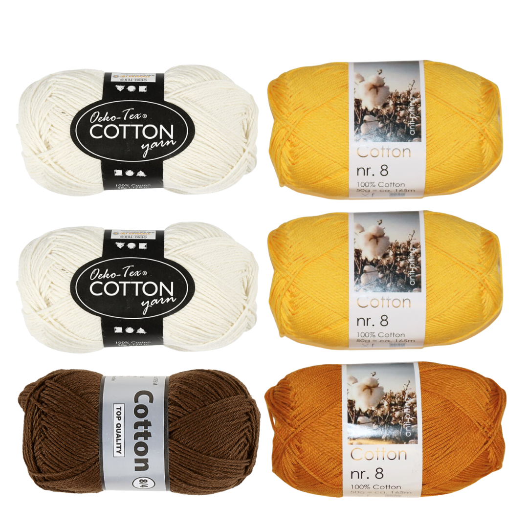 Hæklekittet indeholder materialer nok til at lave omkring 40 firkanter – det præcise antal kommer an på din hæklefasthed. Hvis du ønsker at hækle en bredere hvid kant på, skal du bruge ekstra hvidt garn, i garnpakken er det Oeko-Tex bomuld 8/4 i farven råhvid der medfølger.